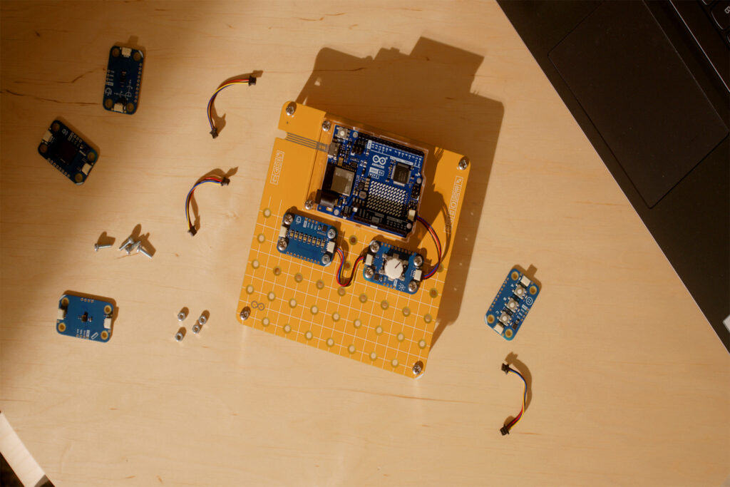 Solo deben conectar los Modulinos a la placa UNO R4 mediante los conectores Qwiic y asegurarlos en la base. Luego, pueden importar las plantillas prediseñadas, lo que les permite configurar y poner en marcha sus proyectos en minutos.